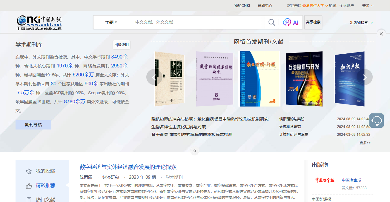 CNKI - 中國期刊全文數據庫 (CAJD)是第一部以全文數據庫形式大規模集成出版學術期刊文獻的電子期刊,是目前具有全球影響力的連續動態更新的中文學術期刊全文數據庫。CAJD還是“十一五”國家重大網絡出版工程的子項目,是《國家“十一五”時期文化發展規劃綱要》中國家“知識資源數據庫”出版工程的重要組成部分。收錄國內學術期刊8490餘種,全文文獻總量6200餘萬篇。