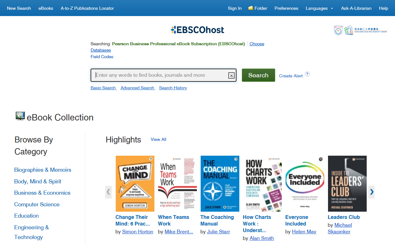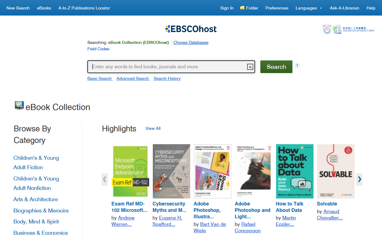 EBSCOhost eBook Collection provides access to an extensive collection of ebook titles in various subjects. It includes a broad range of titles, in areas such as arts & architecture, business & economics, computer science, education, engineering & technology, fiction, history, literature & criticism, political science, religion and social sciences.