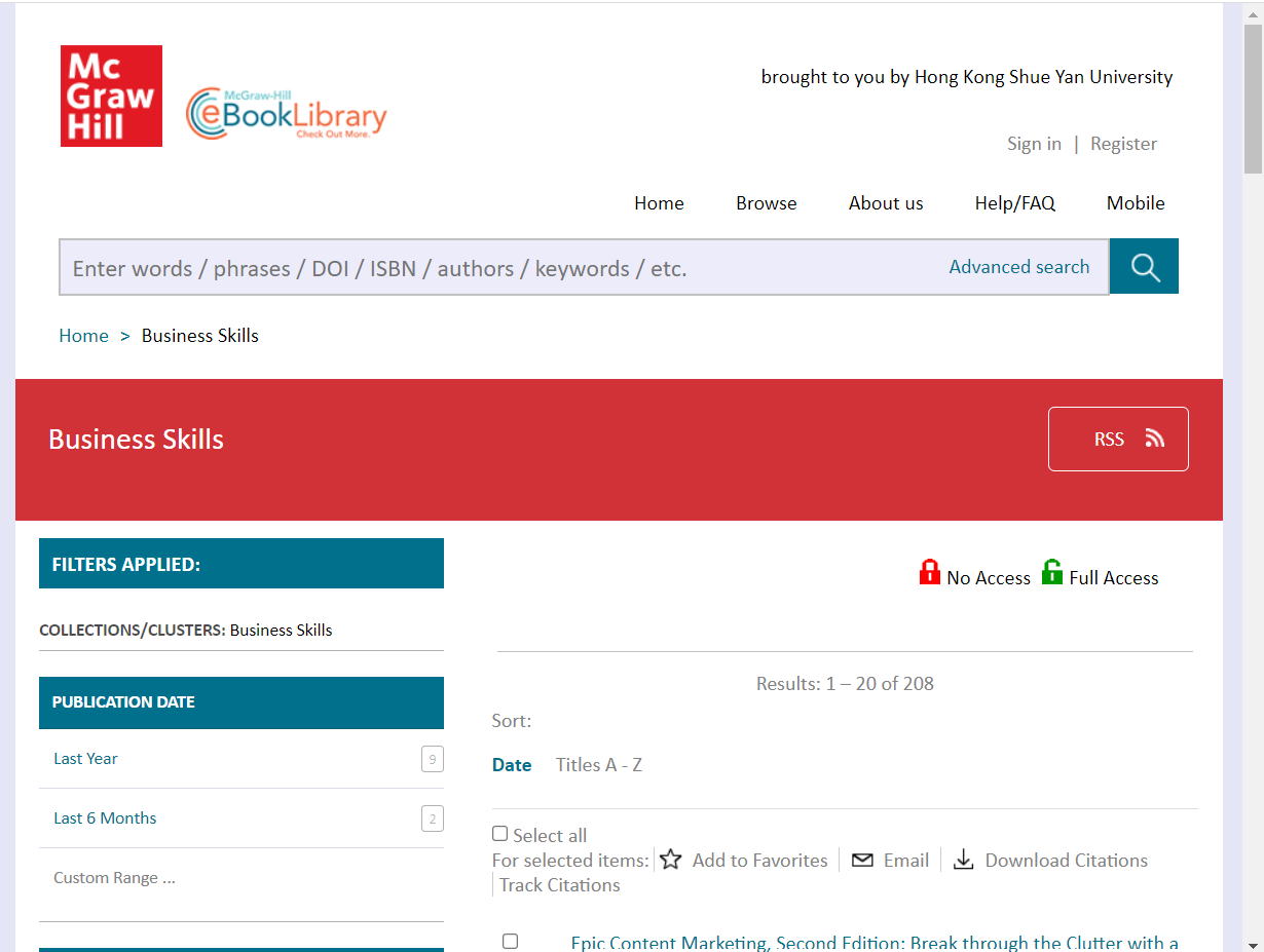 McGraw-Hill eBook Library contains e-book titles available in subscribed business collection, including clusters of Business Skills, Career Advice, Entrepreneurship & Small Business Management, Finance & Investing, Human Resources & Training, Leadership & Management, Process Management, Real Estate, Sales & Marketing. Users can create their own accounts, add notes, bookmarks and highlights and print parts of the book for their personal use.