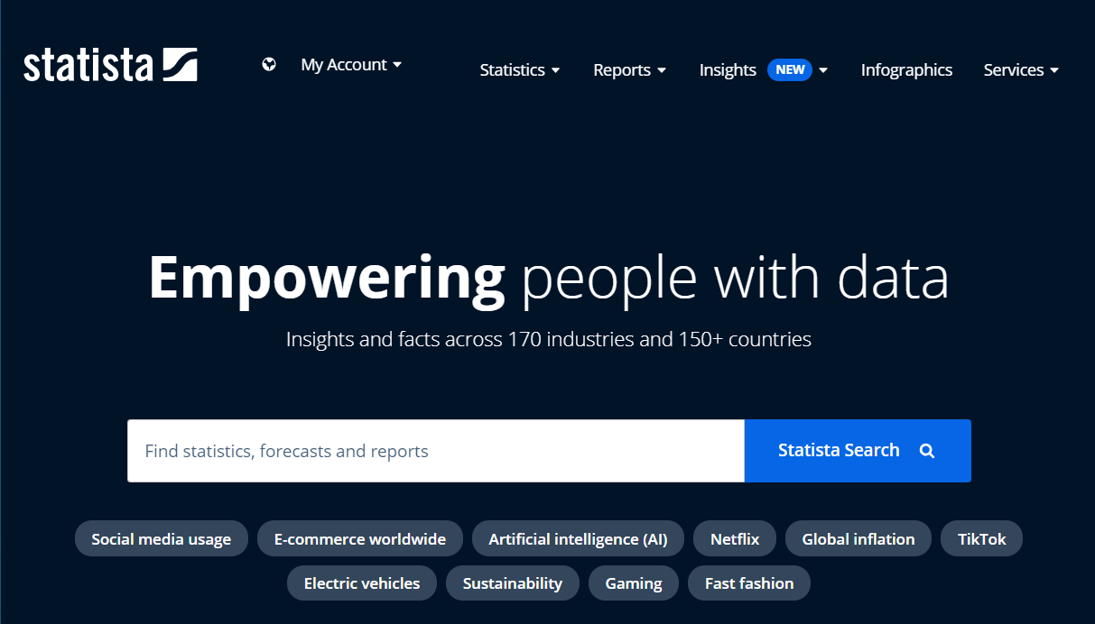 Statista is a leading global data and business intelligence platform, established in Germany in 2007, that provides comprehensive access to statistics, reports, and insights across more than 80,000 topics and 170 industries. Serving business professionals, researchers, and educators, Statista consolidates data from over 22,500 sources, presenting information in user-friendly charts and tables available in multiple languages, including English, German, French, and Spanish.
