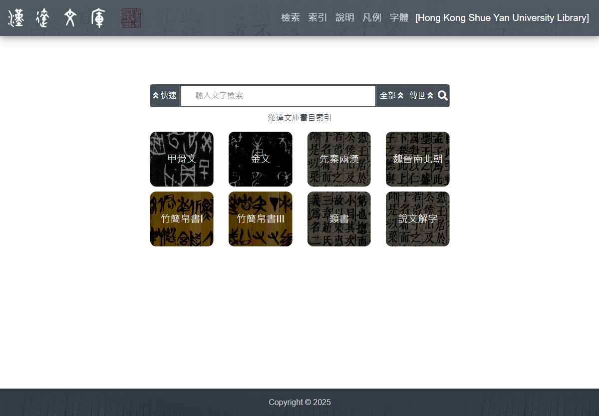 《漢達文庫》由香港中文大學中國文化研究所中國古籍研究中心於1998年創建,迄今已收錄七個中國古代傳世文獻及出土文獻專題資料庫,包括「甲骨文」、「金文」、「先秦兩漢文獻」、「魏晉南北朝文獻」、「竹簡帛書文獻」、「傳統類書」、「說文解字」,總字數逾8000萬字。
