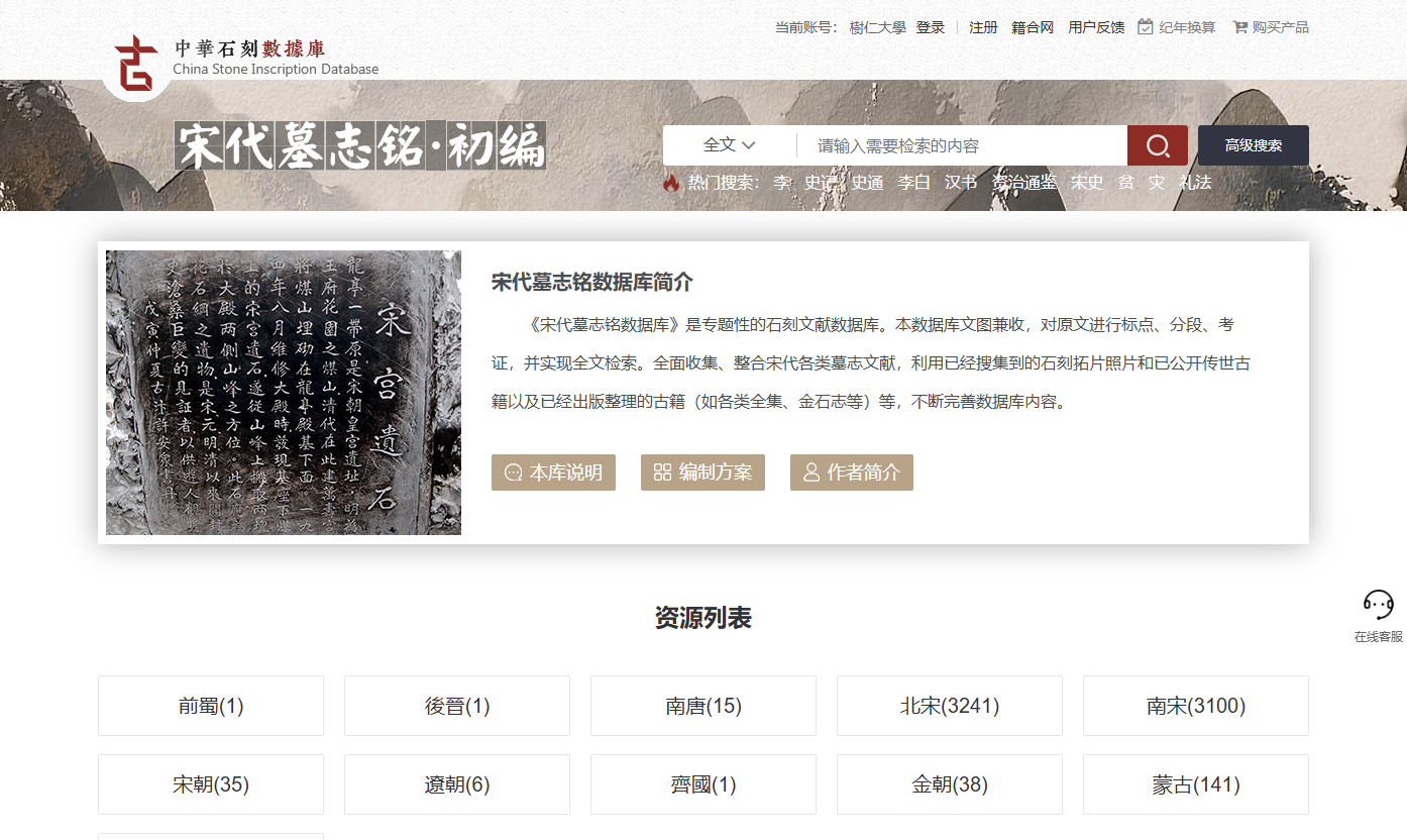《宋代墓誌銘資料庫》是專題性的石刻文獻資料庫。本資料庫文圖兼收,對原文進行標點、分段、考證,並實現全文檢索。全面收集、整合宋代各類墓誌文獻,利用已經蒐集到的石刻拓片照片和已公開傳世古籍以及已經出版整理的古籍(如各類全集、金石誌等)等,不斷完善資料庫內容。