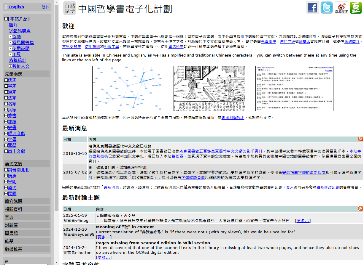 《中國哲學書電子化計劃》是一個線上古籍文獻檢索系統,提供盡可能精確且便利使用的中國古代原典文獻(尤其先秦兩漢文獻),把這些資料以恰當結構、可搜索模式來展現,並且廣泛使用現代技術作為工具使這些文獻更容易學習和研究,因而使更多人有機會接觸這些原典文獻。