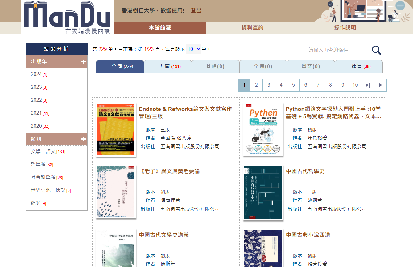 《Man’Du 漫讀電子書》是一個內容豐富且多元的電子書平台,收錄超過7000冊書籍,涵蓋多個出版社的作品,如學術教科書出版社【五南】、公職證照類出版社【鼎文】、經典文學出版社【遠景】、電腦資訊類出版社【碁峰】、宗教哲學類出版社【全佛】等。平台內的書籍主題包括理工、研究方法、財經商管、醫護生命科學、公職考試、經典文學與宗教哲學等領域,提供全文檢索功能,方便用戶快速尋找章節內容和相關資訊。這個平台整合了多個電子書庫,如原《五南電子書庫》和《遠景電子書》,成為一個綜合性電子書資源庫,便於教學與學習使用。