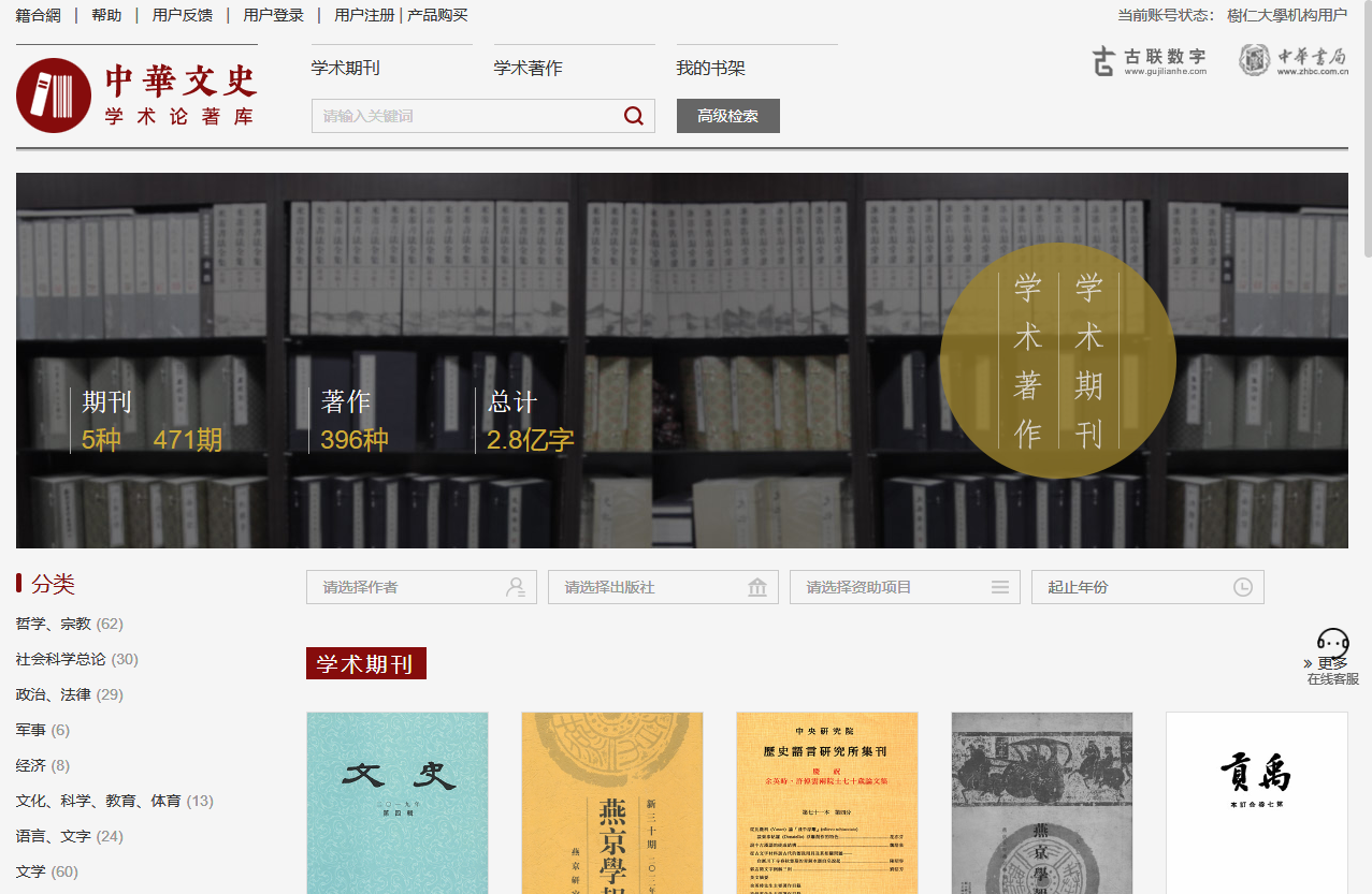 《中華文史學術論著庫》是中國學術資源全文資料庫。本庫以高質量的學術成果為資源主體,涵蓋與中國傳統文化相關的文學、歷史、哲學等專業學科。現已推出具有相當水準的核心學術期刊5種471期,學術著作396種,學術著作主要為在學術史上占據重要地位的名家名著,總計約2.8億字。例如:《文史》、《歷史語言研究所集刊》、《禹貢》、《三松堂全集》、《唐長孺文集》、《王力文集》、《張岱年文集》等。