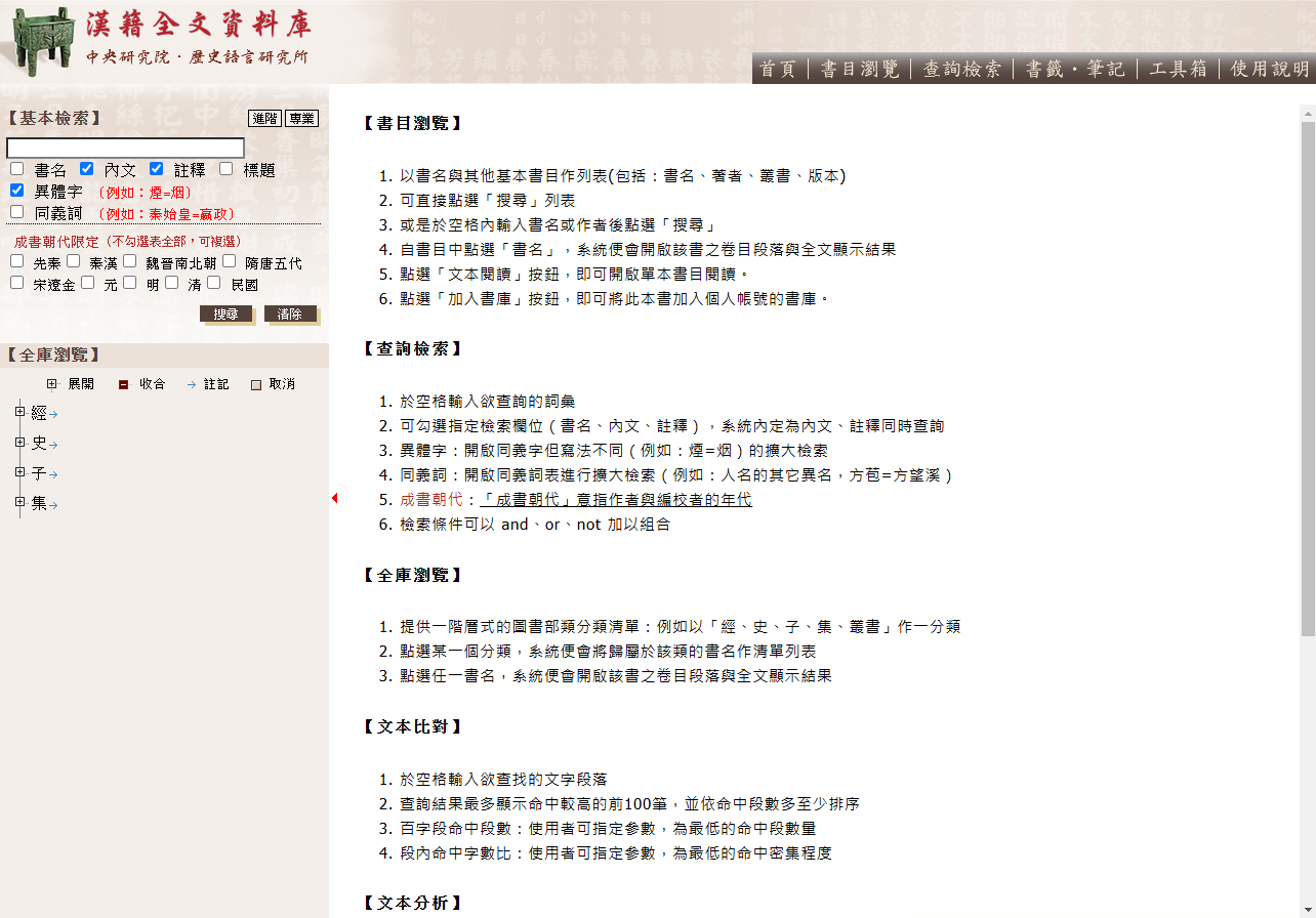 《漢籍全文資料庫計畫》的建置肇始於1984年,為「史籍自動化」計畫的延伸,開發的目標是為了收錄對中國傳統人文研究具有重要價值的文獻,並建立全文電子資料庫,以作為學術研究的輔助工具。「漢籍全文資料庫」是目前最具規模、資料統整最為嚴謹的中文全文資料庫之一。