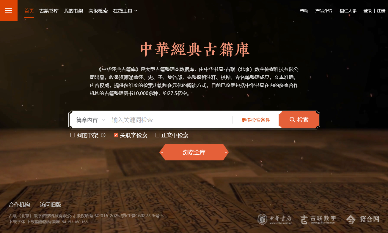 《中華經典古籍庫》主要收錄中華書局出版的點校本古籍,從2017年1月開始也收錄其他出版社出版的優秀古籍類圖書,如鳳凰出版社的《冊府元龜》、《全元文》、齊魯書社的《宋代序跋全編》等。收錄的古籍圖書涵蓋-經史子集各部,包含點校本二十四史、通鑒、新編諸子集成、歷代史料筆記叢刊、清人十三經注疏、佛教典籍選刊等系列,保留圖書完整的前言、注釋、校勘等資料。