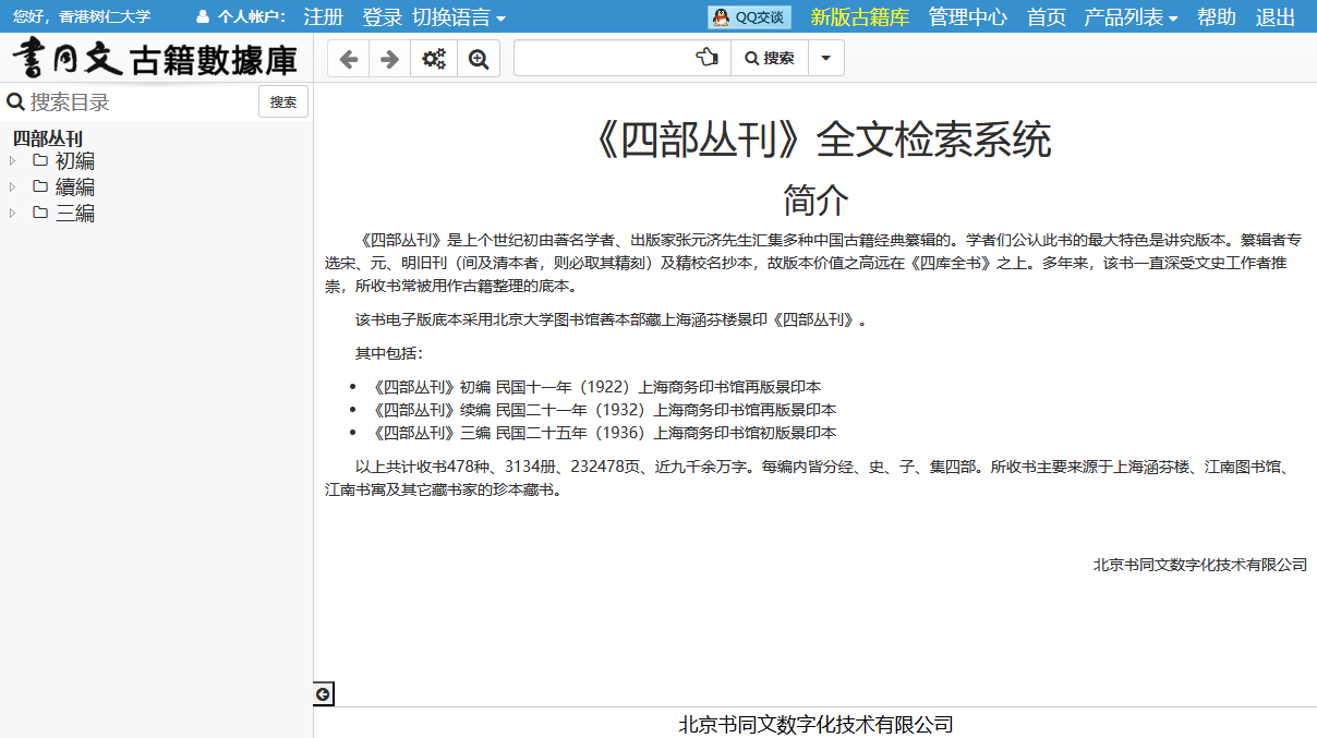 該數據庫現已改版升級,現時圖書館已訂購所有期數「第一至第十二期」,讀者可閱讀所有篇章的全文。數據庫也提供「原書頁面呈現區」閱讀模式、書內檢索、正文中檢索等功能,另包含專名詞庫、紀年換算、聯機詞典、字符查詢等在線工具。
