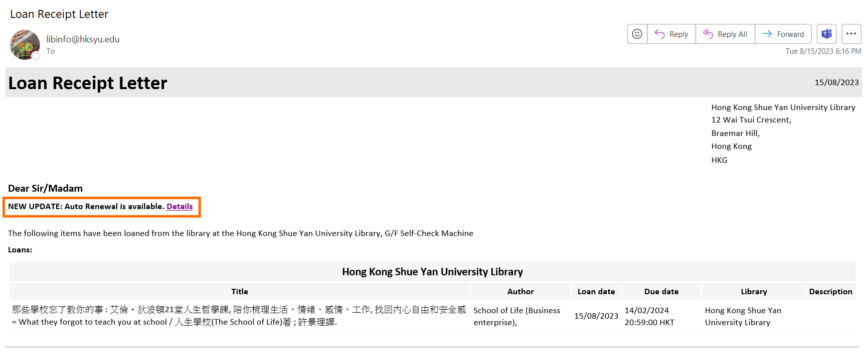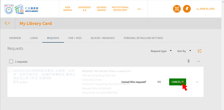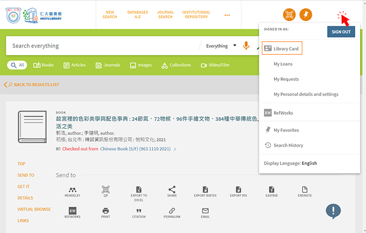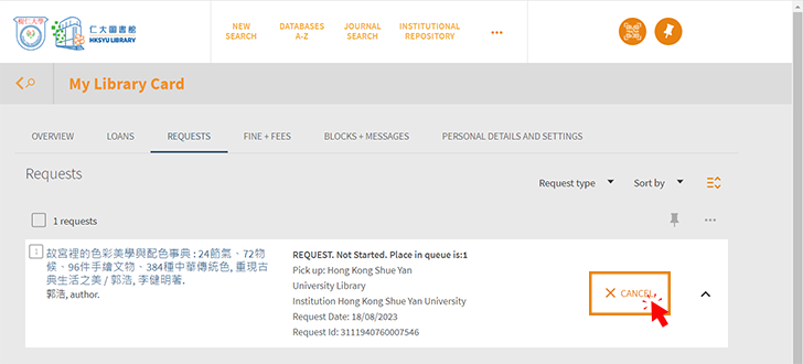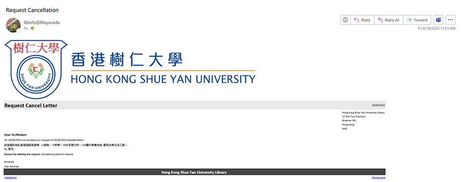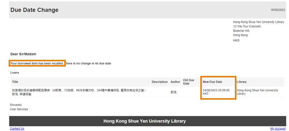 A recall is a request to get an item back from another patron. The request service may lead to a recall of the checked-out items and may shorten their due date. The Library will send a recall notice to inform the current borrower about the change of due date. Please always check your email notifications and items being recalled cannot be renewed.