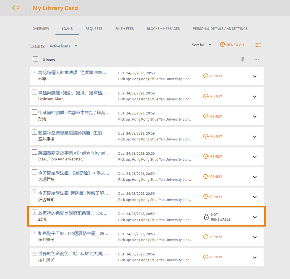 Borrowed items with normal loan periods may be renewed in “My Circulation Record”, please refer to maximum loan period (with renewal). The new due date will be calculated from the date of renewal.