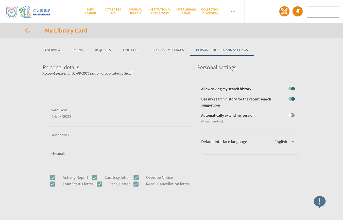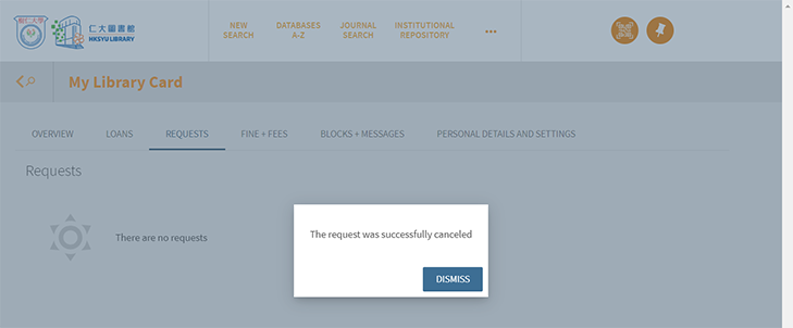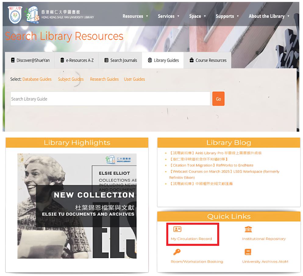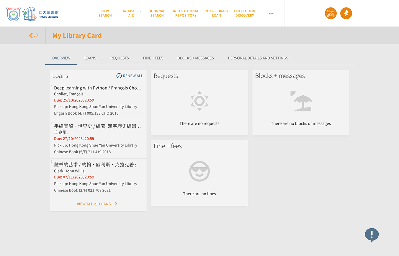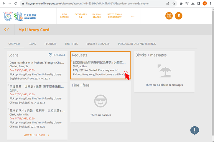 "My Circulation Record" allows you to view all your loans, requested items, fine + fee records.