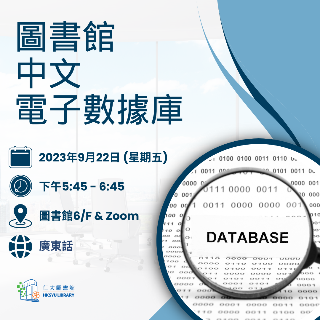 日期︰2023年9月22日 (星期五) 時間︰下午5時45分至下午6時45分 地點︰圖書館6樓 及 Zoom 語言︰粵語 內容︰工作坊會介紹圖書館的中文電子資料庫,包括︰