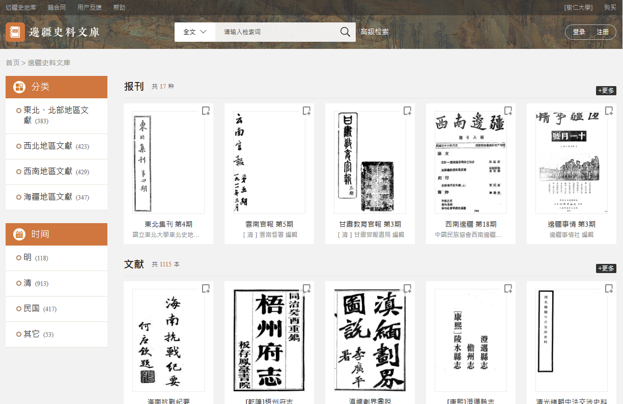《瀚文民國書庫》內容豐富、分類專業、具備全文檢索功能,可為研究中國近代的歷史、文化提供深入的幫助。 《瀚文民國書庫》中收錄的所有圖書均實現了全文數字化(數量超過二千萬頁),可檢索文字數量超過60億字。支持全文檢索、精確檢索和模糊檢索;支持多字段、多條件的組合檢索;支持OR、AND邏輯檢索。無需安裝插件,支持簡繁體切換。可在線閱讀、可下載全文。