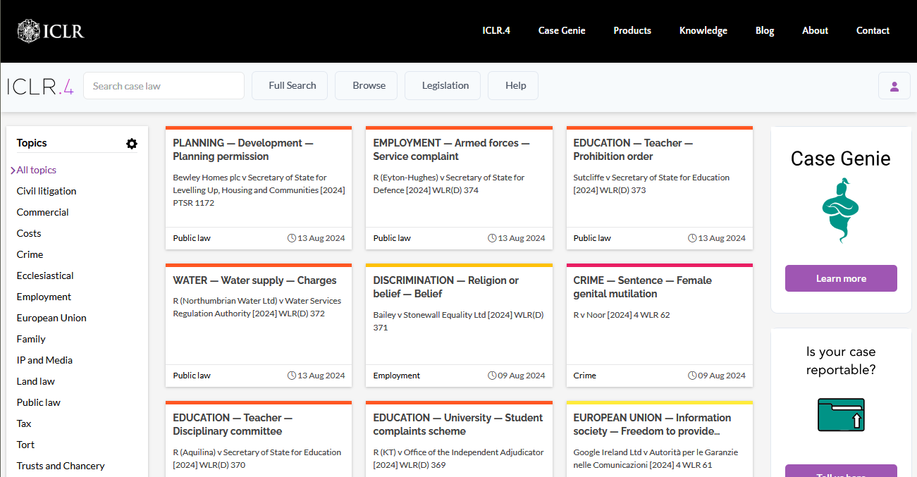 The ICLR Online is the hub of legal authorities in UK dating back to 1865, a dedicated case law platform presenting the cases that matter in a comprehensive and readable format. The platform combines the law reports with powerful Citator+ index cards to present all the relevant case information in one screen, making legal research easier than ever, and ICLR judgments are triple checked for accuracy and presented with absolute clarity.