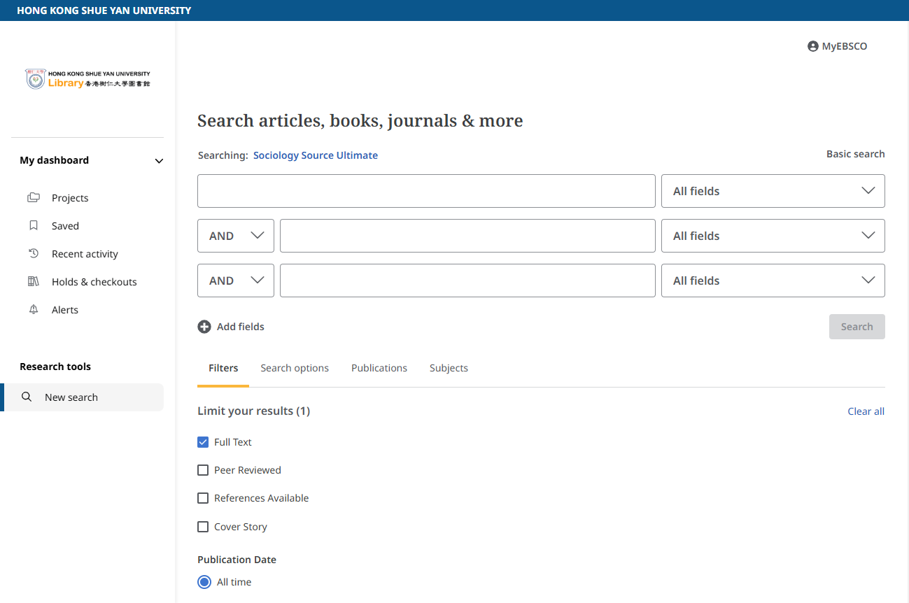 EBSCOhost - Academic Search Ultimate offers students an unprecedented collection of peer-reviewed, full-text journals, including many journals indexed in leading citation indexes. The combination of academic journals, magazines, periodicals, reports, books and videos meets the needs of scholars in virtually every discipline ranging from astronomy, anthropology, biomedicine, engineering, health, law and literacy to mathematics, pharmacology, women's studies, zoology and more.