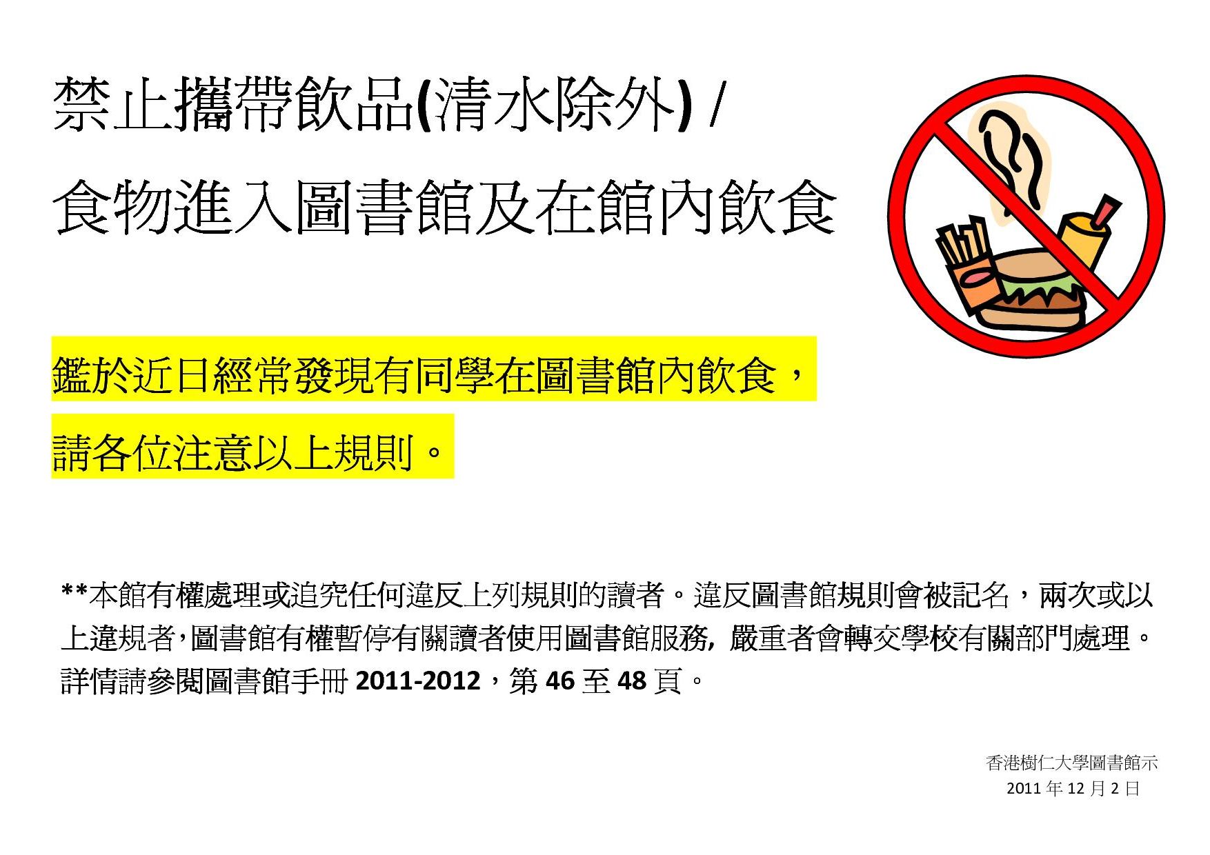 禁 止 攜 帶 飲 品 (清 水 除 外) /食 物 進 入 圖 書 館 及 在 館 內 飲 食