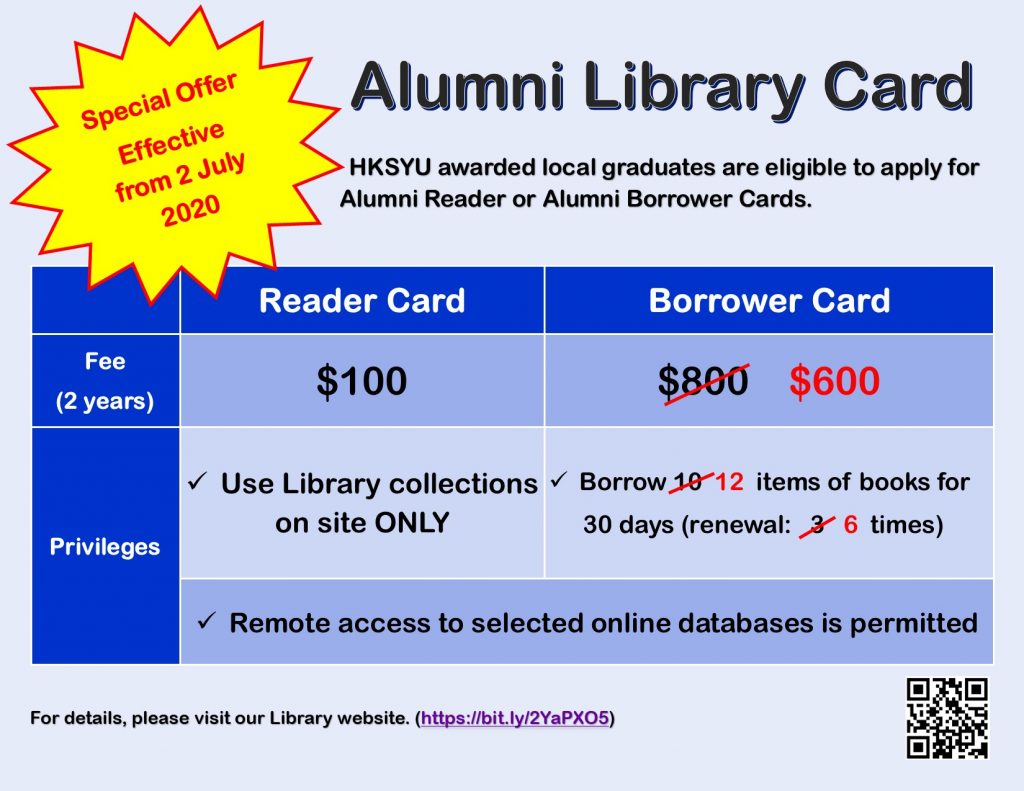 - If you wish to continue using library service, you may apply for an alumni card. For details, please visit the web page https://bit.ly/2YaPXO5 or contact library staff.