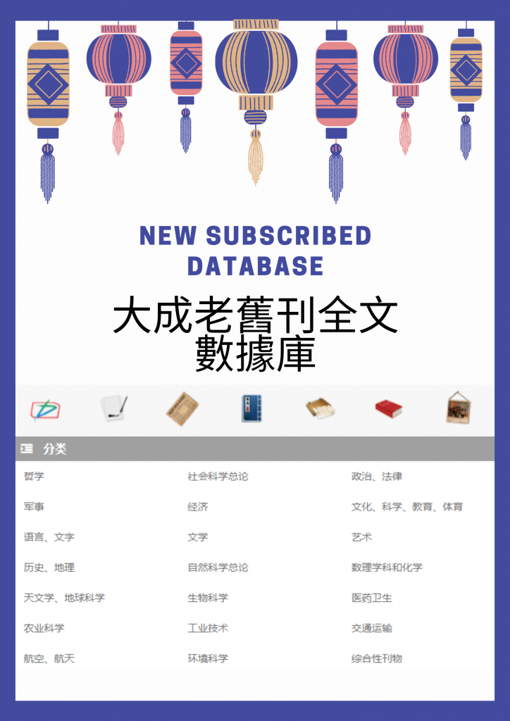 《大成老舊刊全文數據庫》,以收藏1949年前期刊為特點,收藏種類多、內容涵蓋廣、珍本孤本收集較全,使用簡單便捷,目前已收藏數字化期刊7000多種,13萬多期,是研究近代史學、文學、政治學、法學、社會學、經濟學以及各個學科史等學術研究的數據庫工具。