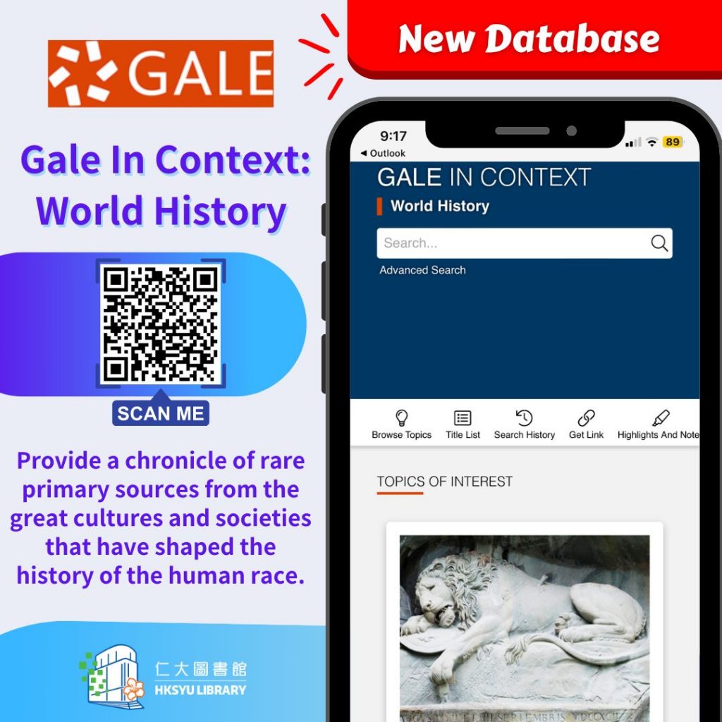 database: Gale In Context: World History for all HKSYU staff and students.