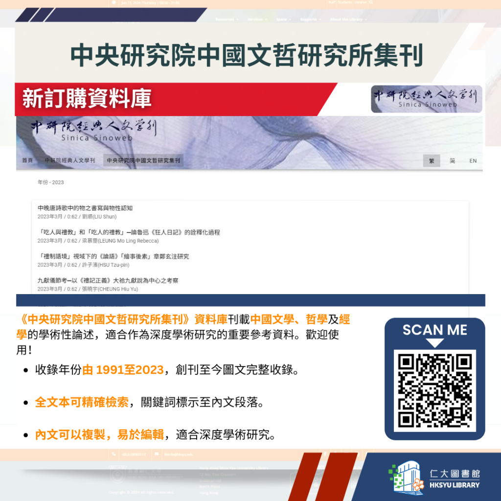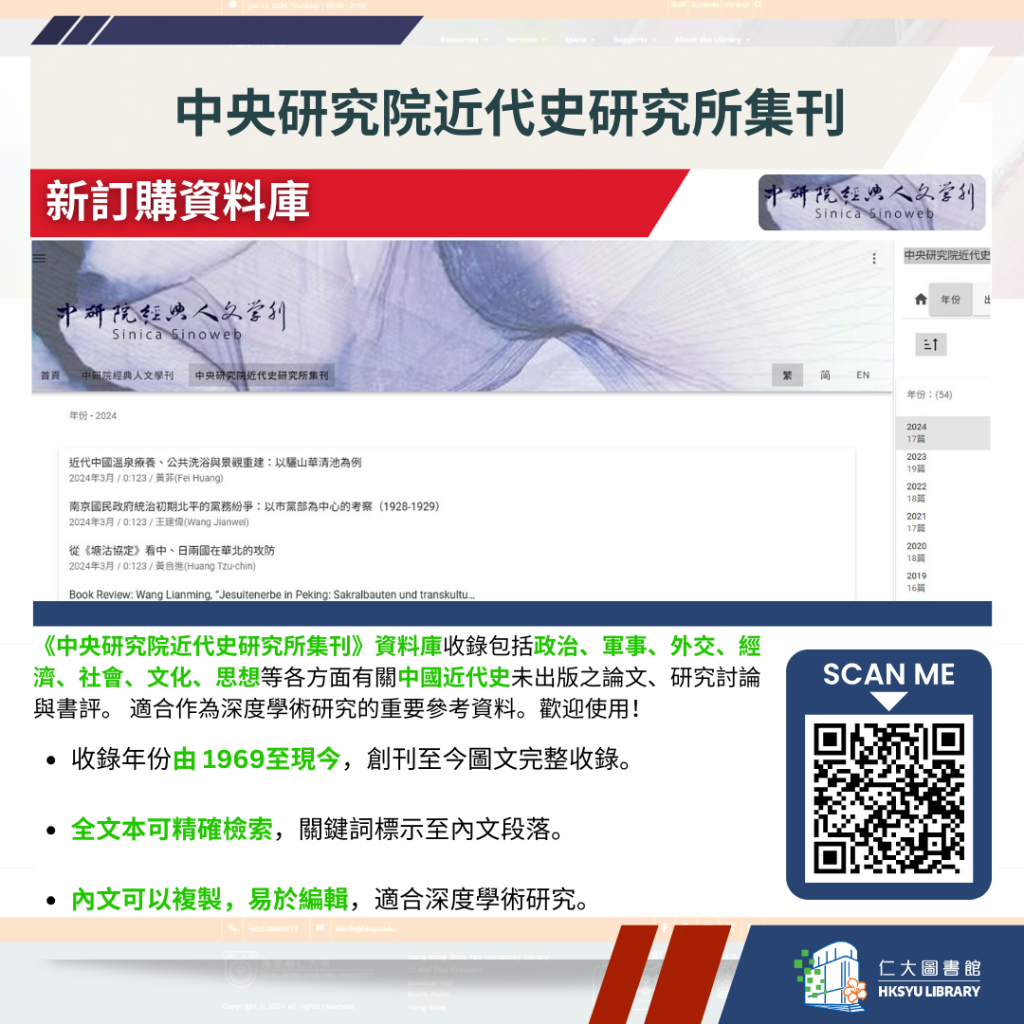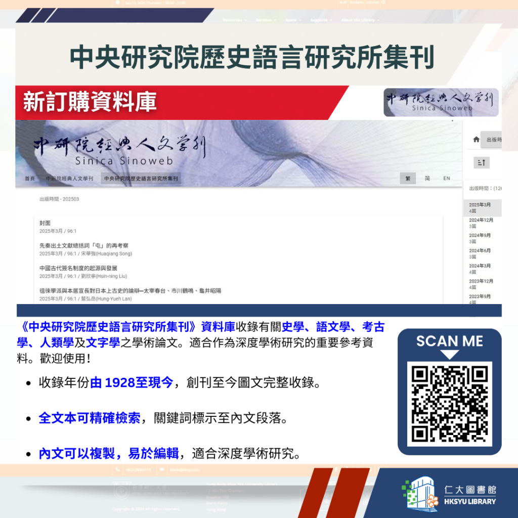 圖書館新增了三個中研院經典人文學刊的期刊資料庫。這些資源完整收錄了多份重要學術期刊從創刊至今的內容,歡迎利用作深入研究。