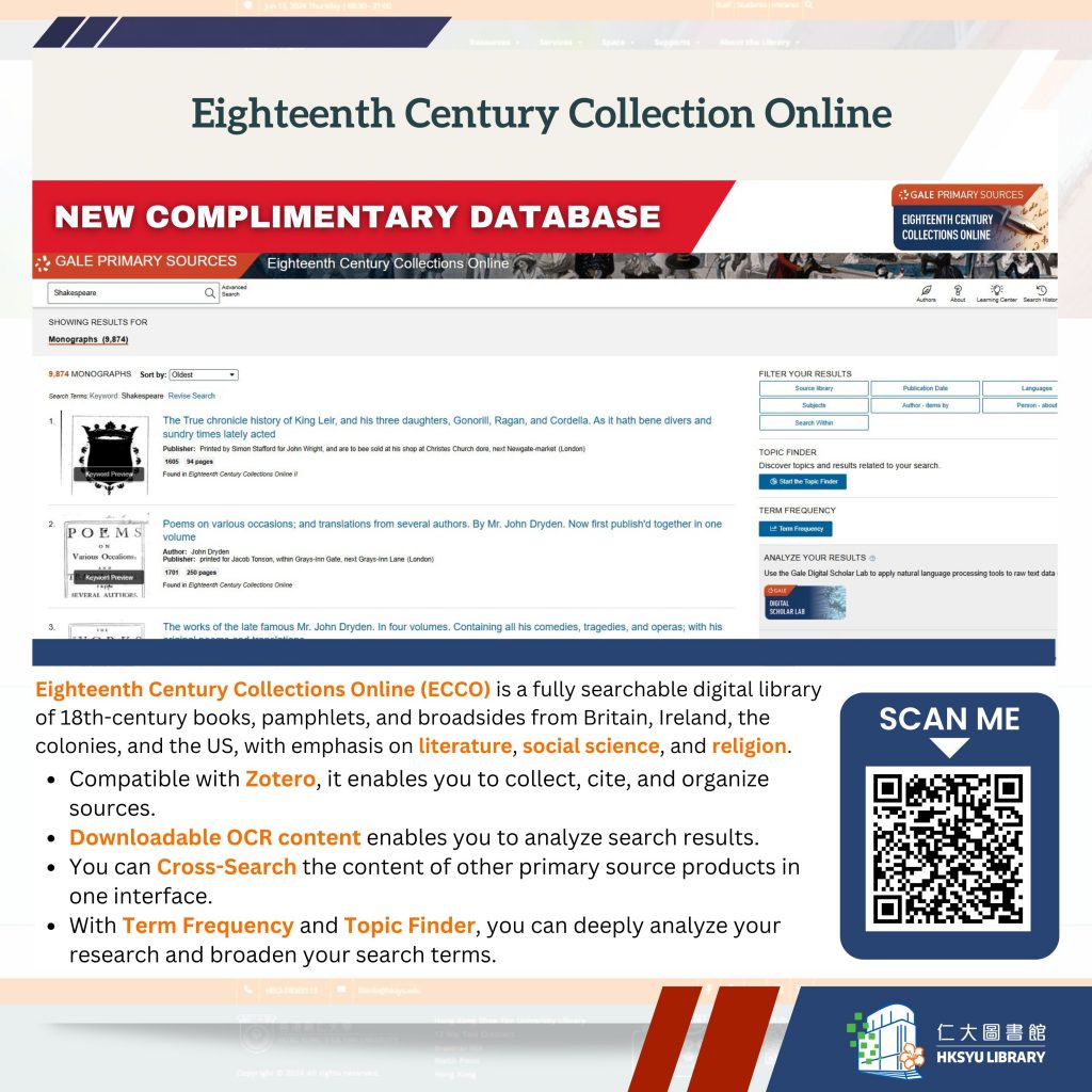 In addition, ECCO is a digital collection of 18th-century works from the English Short-title Catalogue (ESTC), covering publications from Britain, Ireland, British colonies, and the United States.